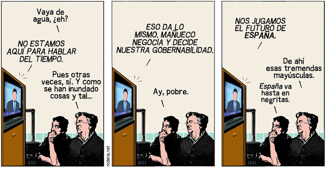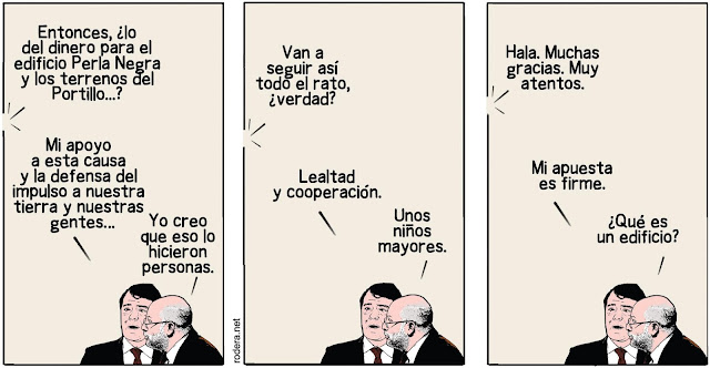 | Domingo 22 de diciembre La redistribución de la riqueza consiste en que toda la que se le escape a unos cuantos hay que revertírsela rápidamente. Si no, pues se desestabilizan las cosas. Lo decía Rodrigo Rato, que ya era rico porque era de familia de ladrones, pero, ¡ay! no supo parar. |